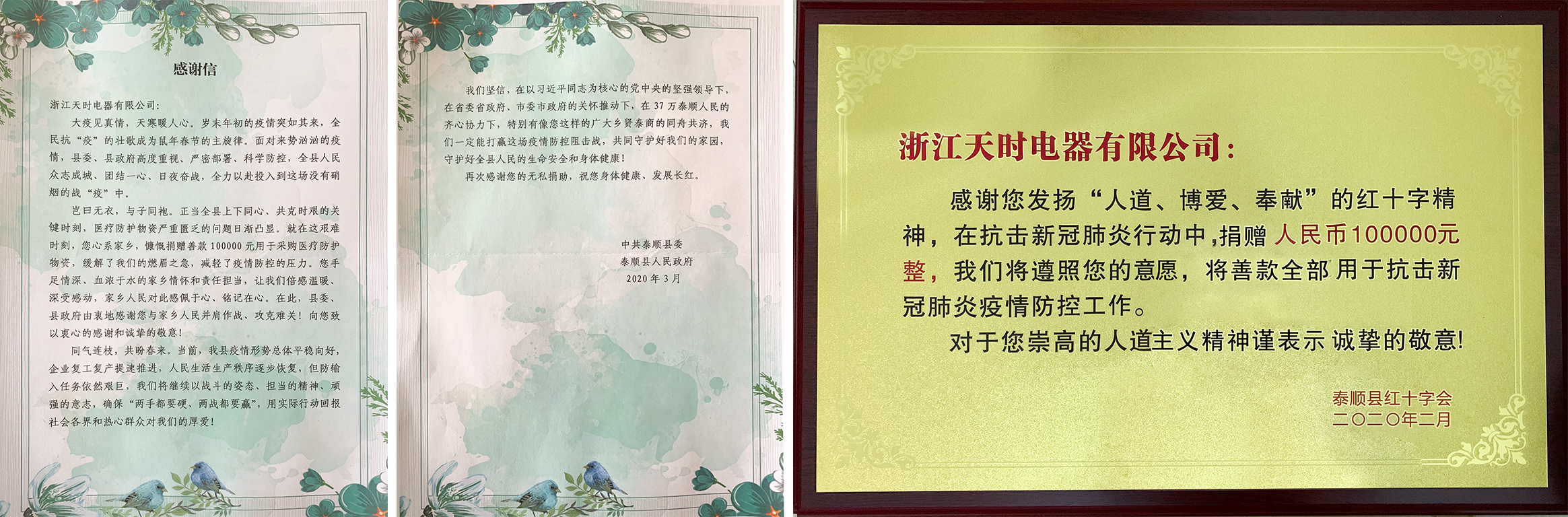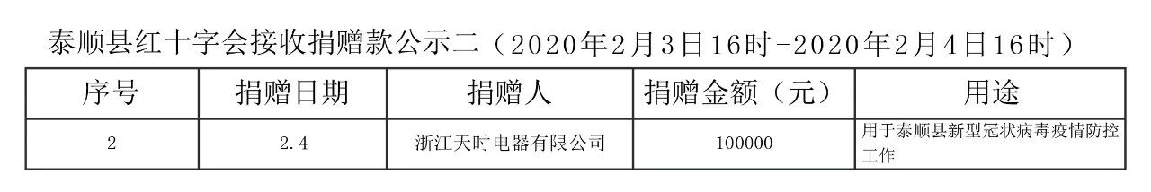 疫情无情人有情。2020年2月4日,立春之际,天时党支部向泰顺县红十字会捐赠了人民币10万元,专项用于泰顺县新型冠状病毒疫情防控工作,为共同抗击疫情贡献企业绵薄之力!